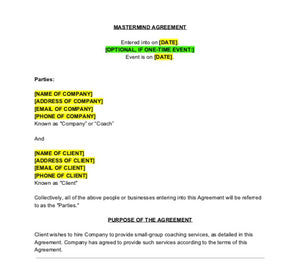 This contract can be used for virtual or in-person masterminds. Includes a Liability Waiver and Media Release for in-person components.